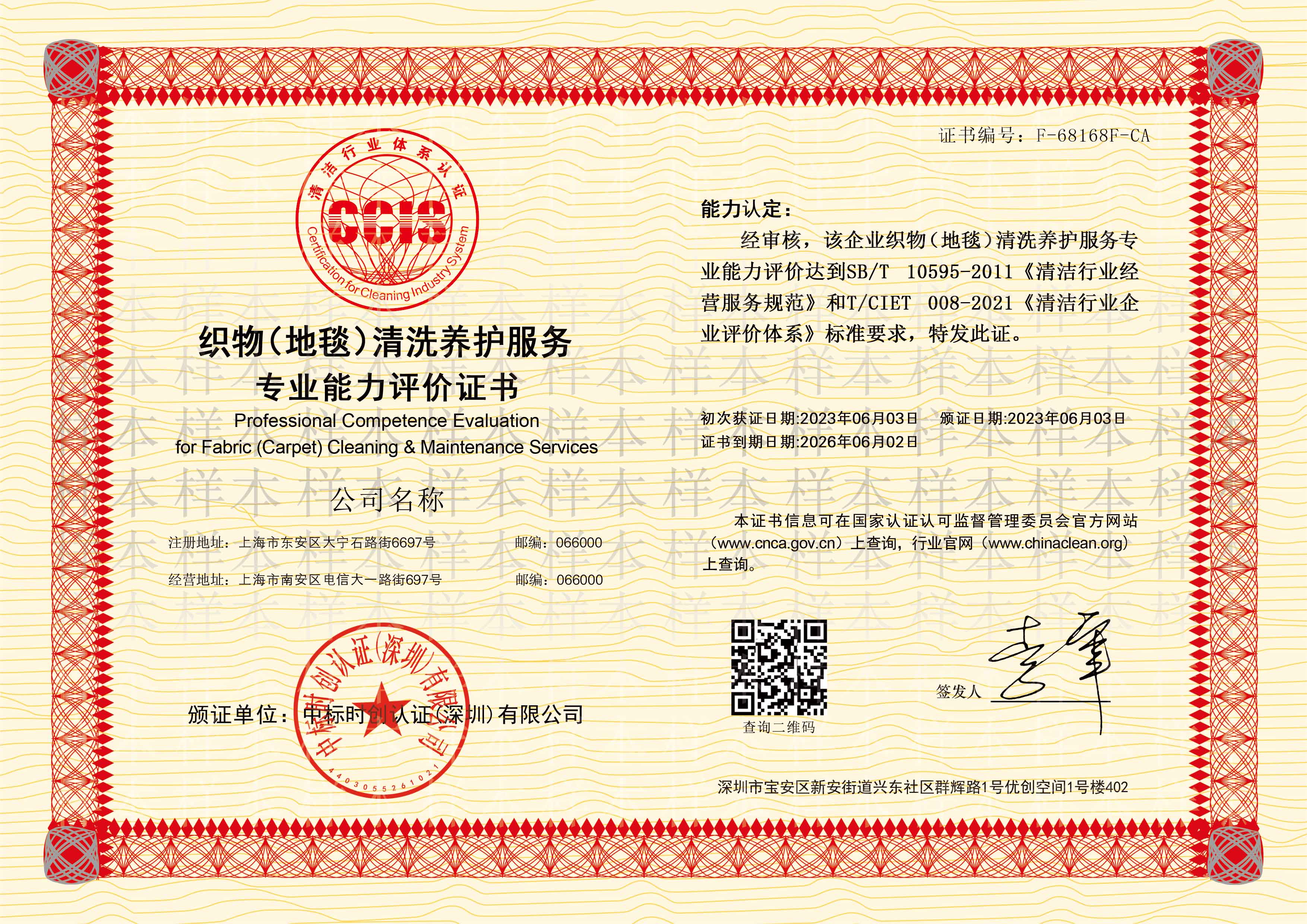 “织物(地毯)清洗养护服务专业能力评价”认证证书是依据商务部行业标准SB/T10595-2011《清洁行业经营服务规范》和团体标准T/CIET 008-2021《清洁行业企业评价体系》,按照国家认证相关规定与要求对企业的认证申请确定审核的可行性、文件评审、编制审核计划、审核组工作的分配和准备审核工作文件,然后进行现场审核,认证复核和认证决定后推荐认证。