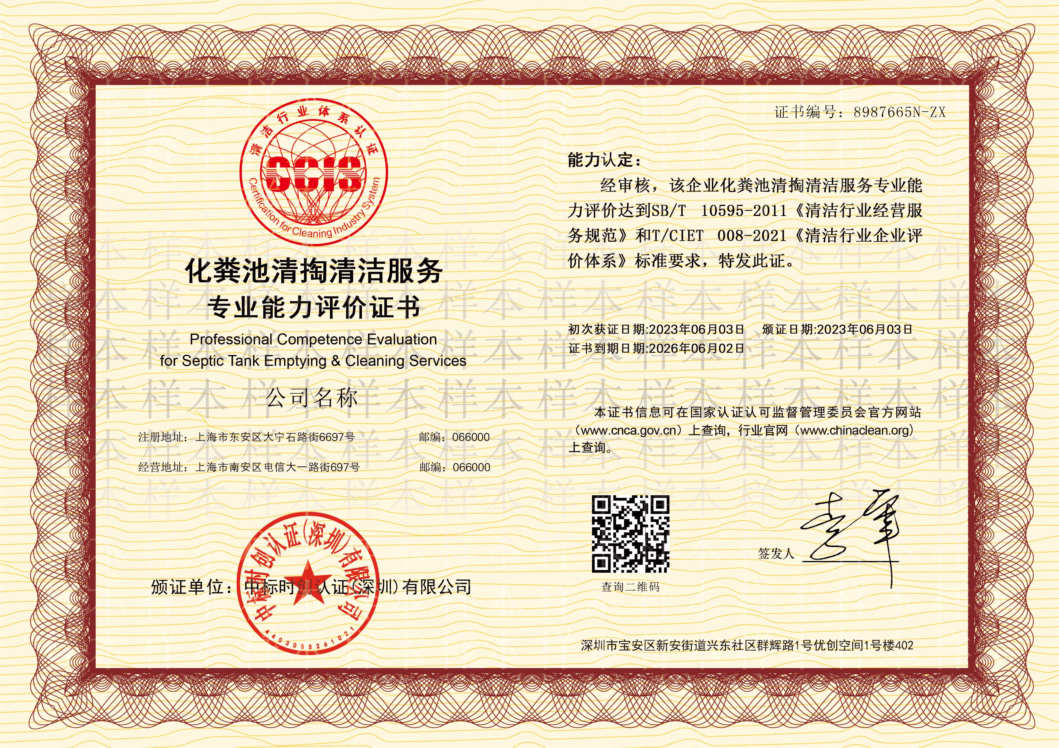 “化粪池清掏清洁服务专业能力评价”认证证书是依据商务部行业标准SB/T10595-2011《清洁行业经营服务规范》和团体标准T/CIET 008-2021《清洁行业企业评价体系》,按照国家认证相关规定与要求对企业的认证申请确定审核的可行性、文件评审、编制审核计划、审核组工作的分配和准备审核工作文件,然后进行现场审核,认证复核和认证决定后推荐认证。