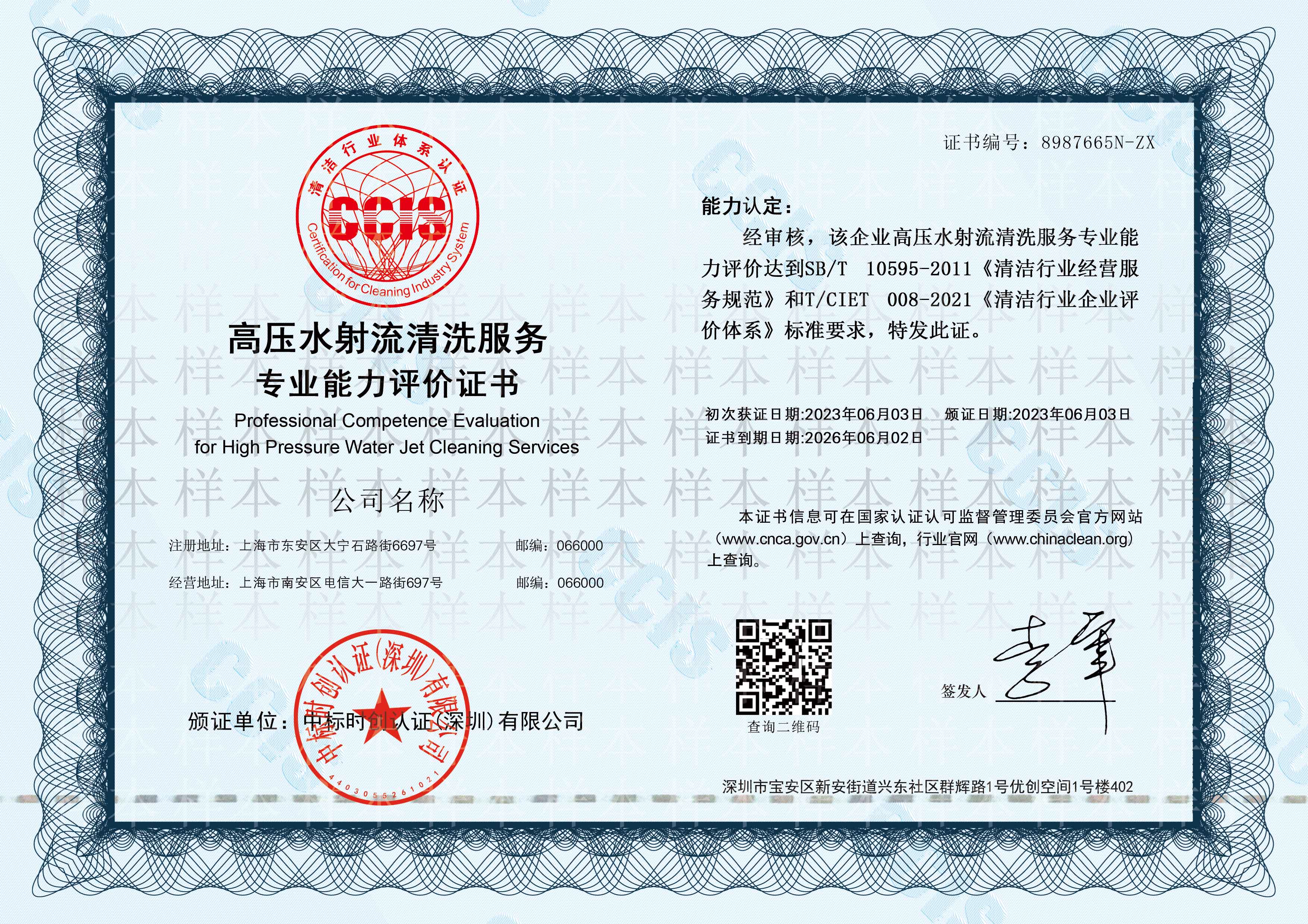 “高压水射流清洗服务专业能力评价”认证证书是依据商务部行业标准SB/T10595-2011《清洁行业经营服务规范》和团体标准T/CIET 008-2021《清洁行业企业评价体系》,按照国家认证相关规定与要求对企业的认证申请确定审核的可行性、文件评审、编制审核计划、审核组工作的分配和准备审核工作文件,然后进行现场审核,认证复核和认证决定后推荐认证。