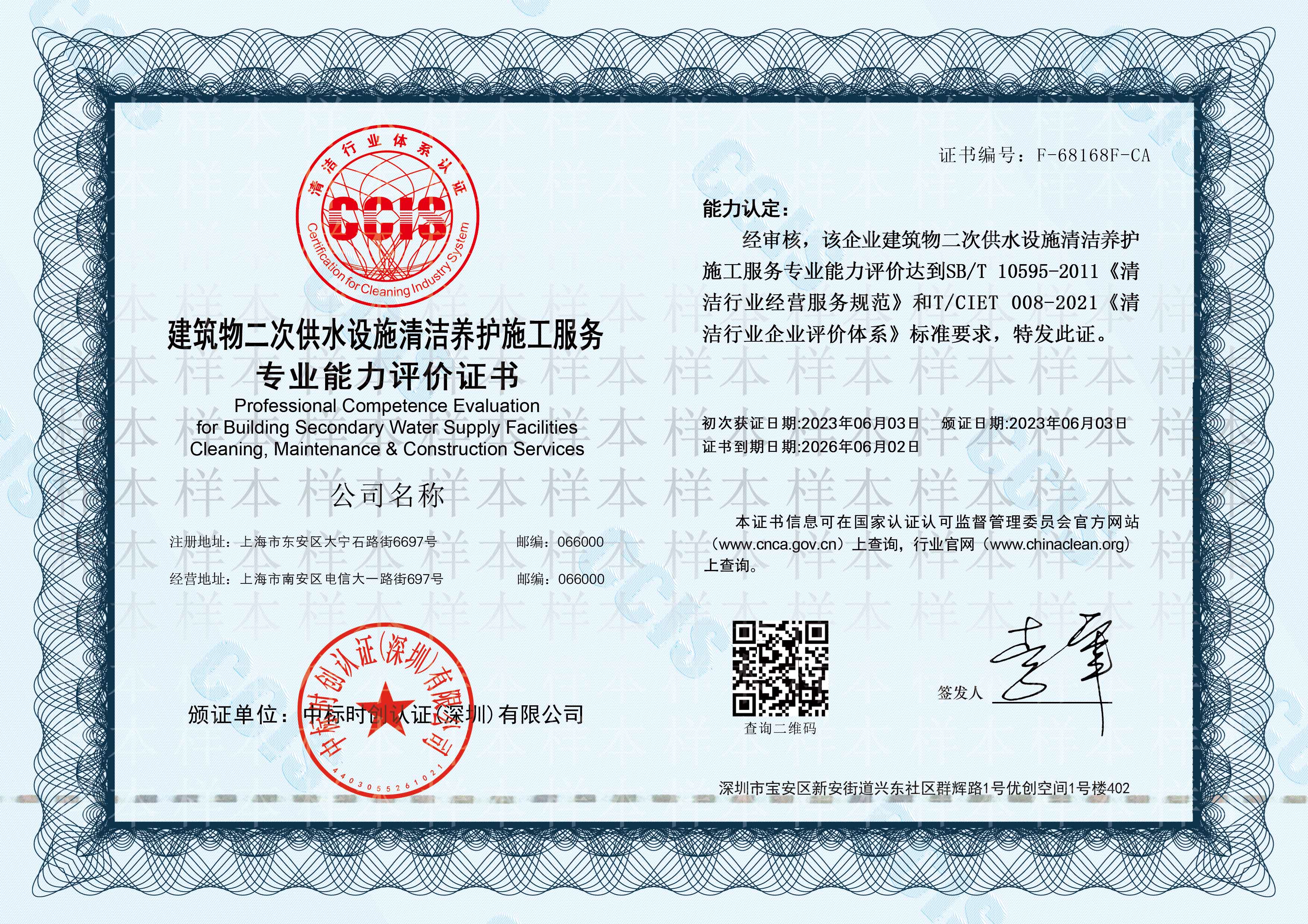“建筑物二次供水设施清洁养护施工服务专业能力评价”认证证书是依据商务部行业标准SB/T10595-2011《清洁行业经营服务规范》和团体标准T/CIET 008-2021《清洁行业企业评价体系》,按照国家认证相关规定与要求对企业的认证申请确定审核的可行性、文件评审、编制审核计划、审核组工作的分配和准备审核工作文件,然后进行现场审核,认证复核和认证决定后推荐认证。