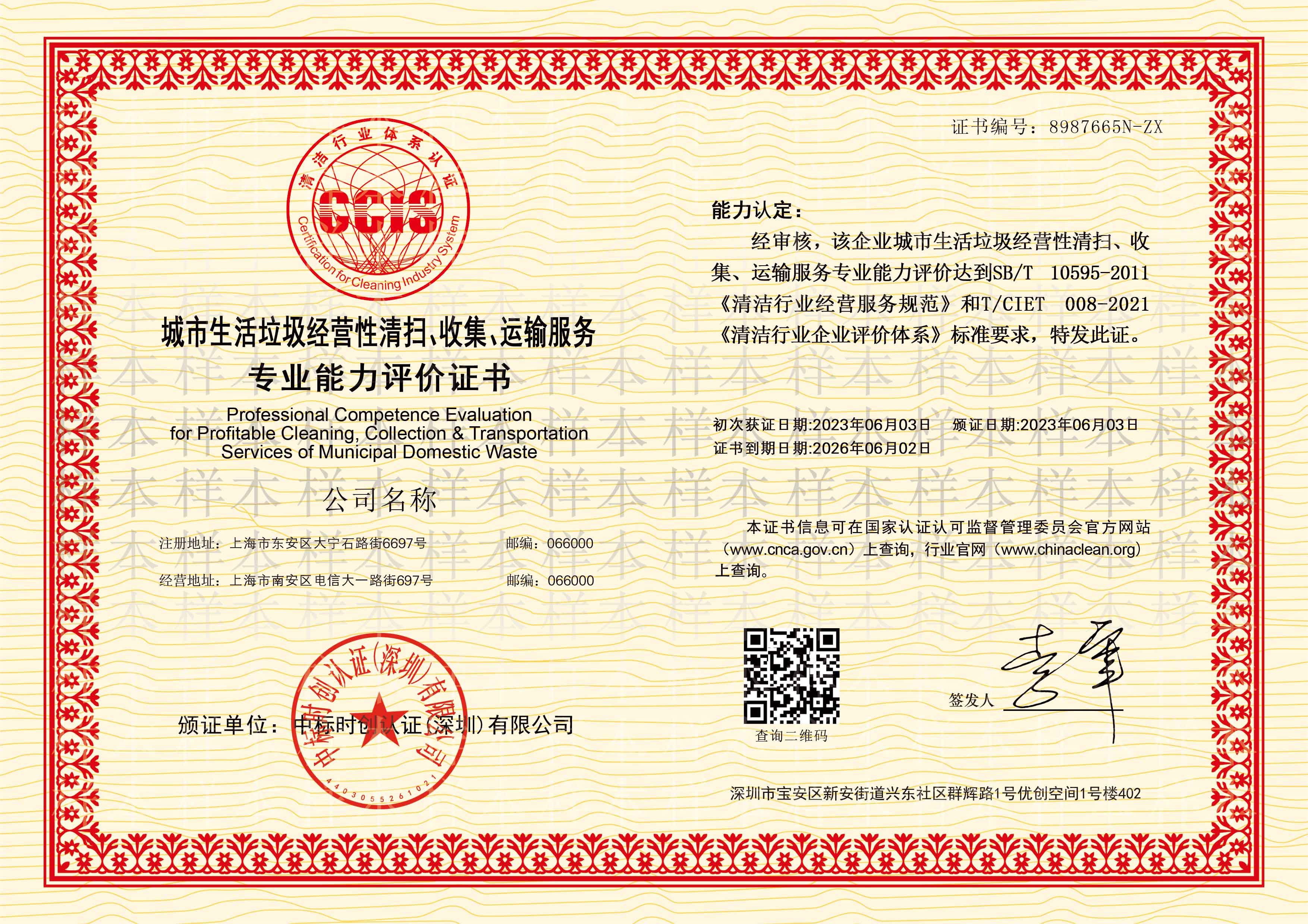 “城市生活垃圾经营性清扫、收集、运输服务专业能力评价”认证证书是依据商务部行业标准SB/T10595-2011《清洁行业经营服务规范》和团体标准T/CIET 008-2021《清洁行业企业评价体系》,按照国家认证相关规定与要求对企业的认证申请确定审核的可行性、文件评审、编制审核计划、审核组工作的分配和准备审核工作文件,然后进行现场审核,认证复核和认证决定后推荐认证。