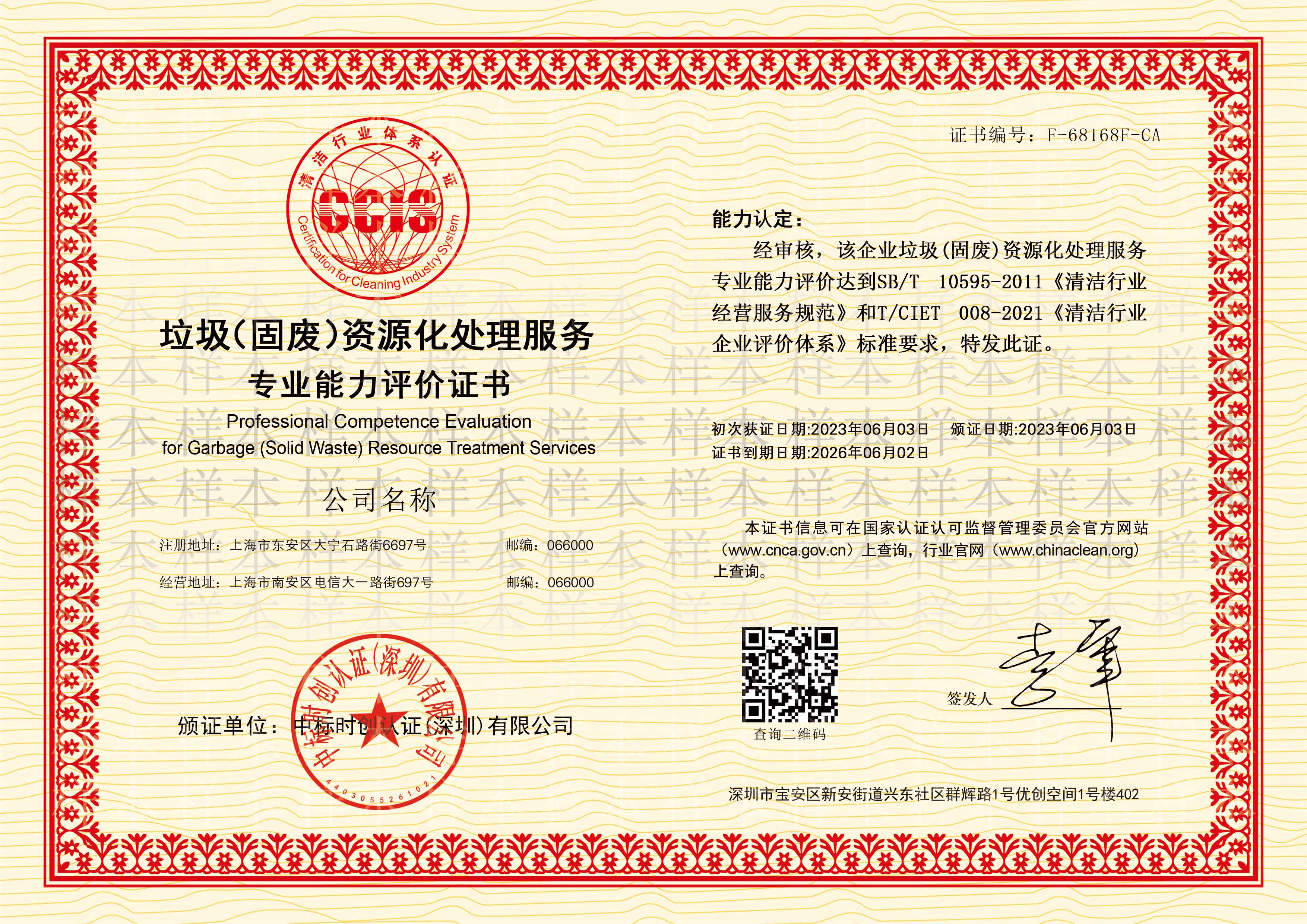 “垃圾(固废)资源化处理服务专业能力评价”认证证书是依据商务部行业标准SB/T10595-2011《清洁行业经营服务规范》和团体标准T/CIET 008-2021《清洁行业企业评价体系》,按照国家认证相关规定与要求对企业的认证申请确定审核的可行性、文件评审、编制审核计划、审核组工作的分配和准备审核工作文件,然后进行现场审核,认证复核和认证决定后推荐认证。