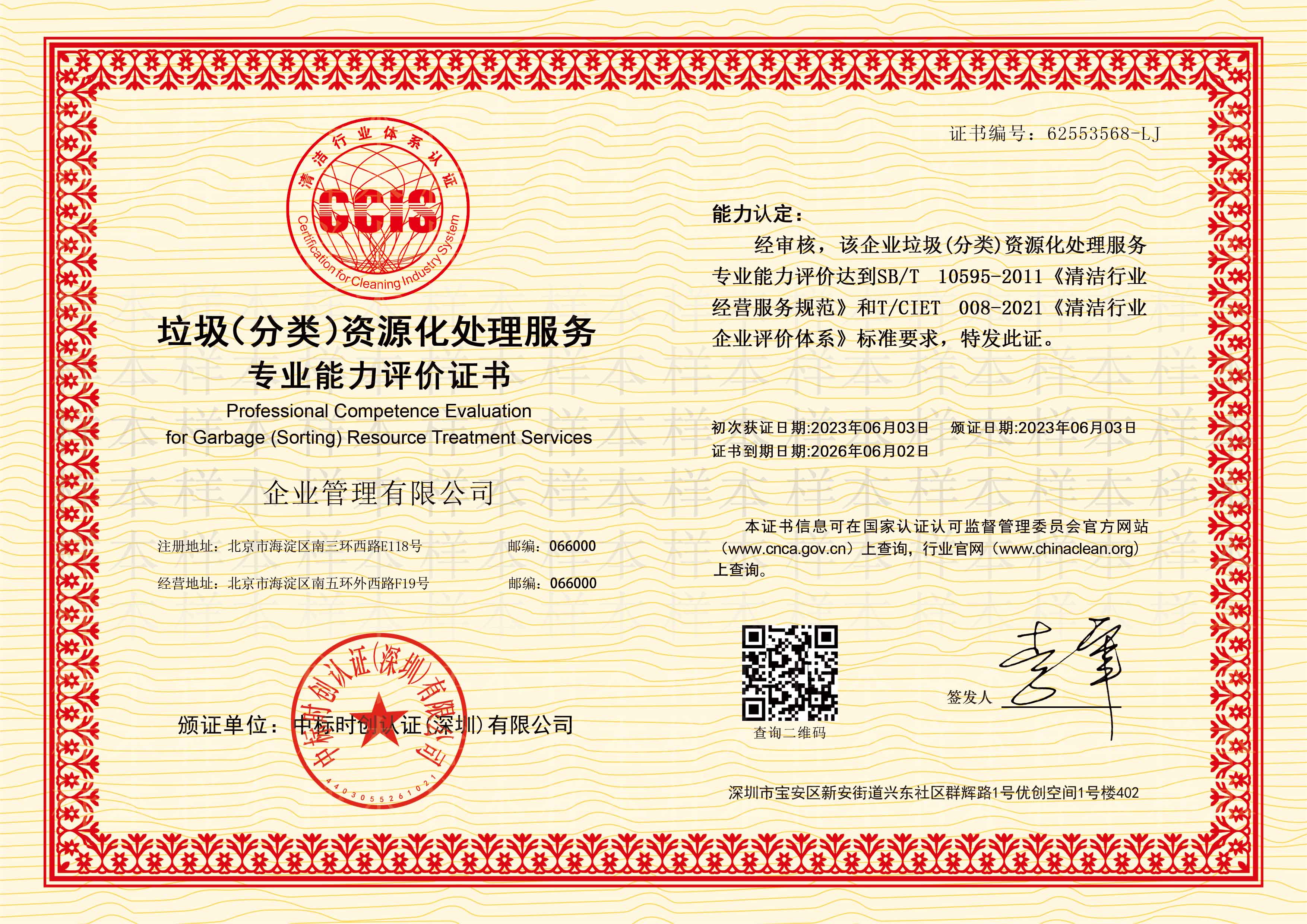“垃圾(分类)资源化处理服务专业能力评价”认证证书是依据商务部行业标准SB/T10595-2011《清洁行业经营服务规范》和团体标准T/CIET 008-2021《清洁行业企业评价体系》,按照国家认证相关规定与要求对企业的认证申请确定审核的可行性、文件评审、编制审核计划、审核组工作的分配和准备审核工作文件,然后进行现场审核,认证复核和认证决定后推荐认证。