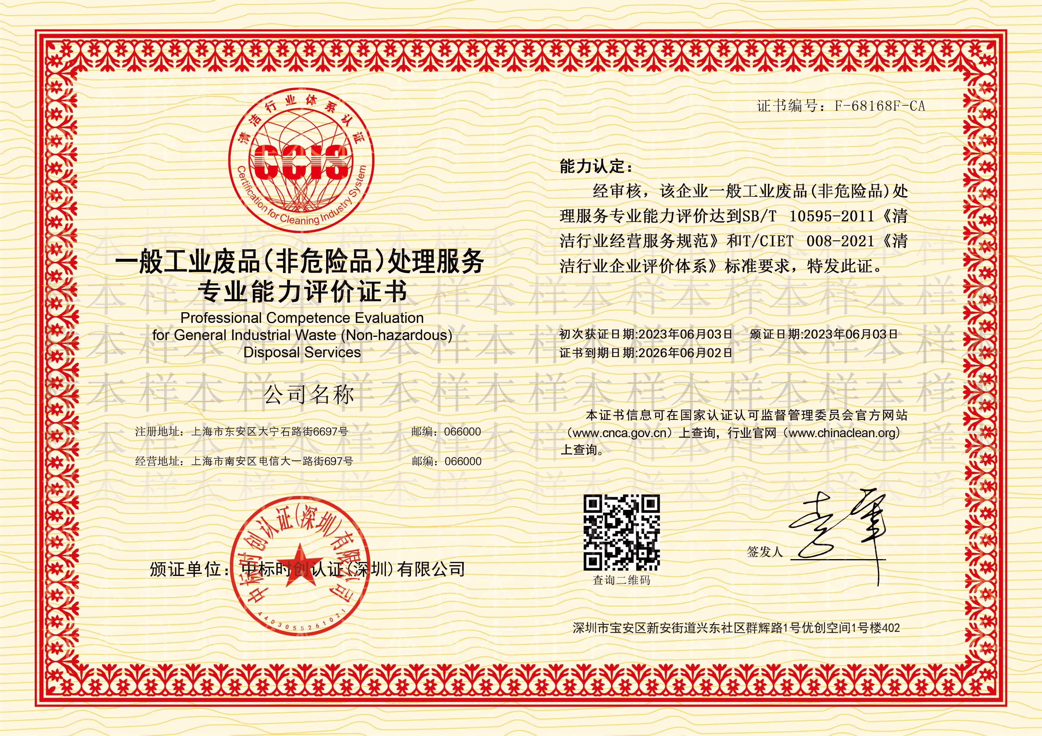 “一般工业废品(非危险品)处理服务专业能力评价”认证证书是依据商务部行业标准SB/T10595-2011《清洁行业经营服务规范》和团体标准T/CIET 008-2021《清洁行业企业评价体系》,按照国家认证相关规定与要求对企业的认证申请确定审核的可行性、文件评审、编制审核计划、审核组工作的分配和准备审核工作文件,然后进行现场审核,认证复核和认证决定后推荐认证。
