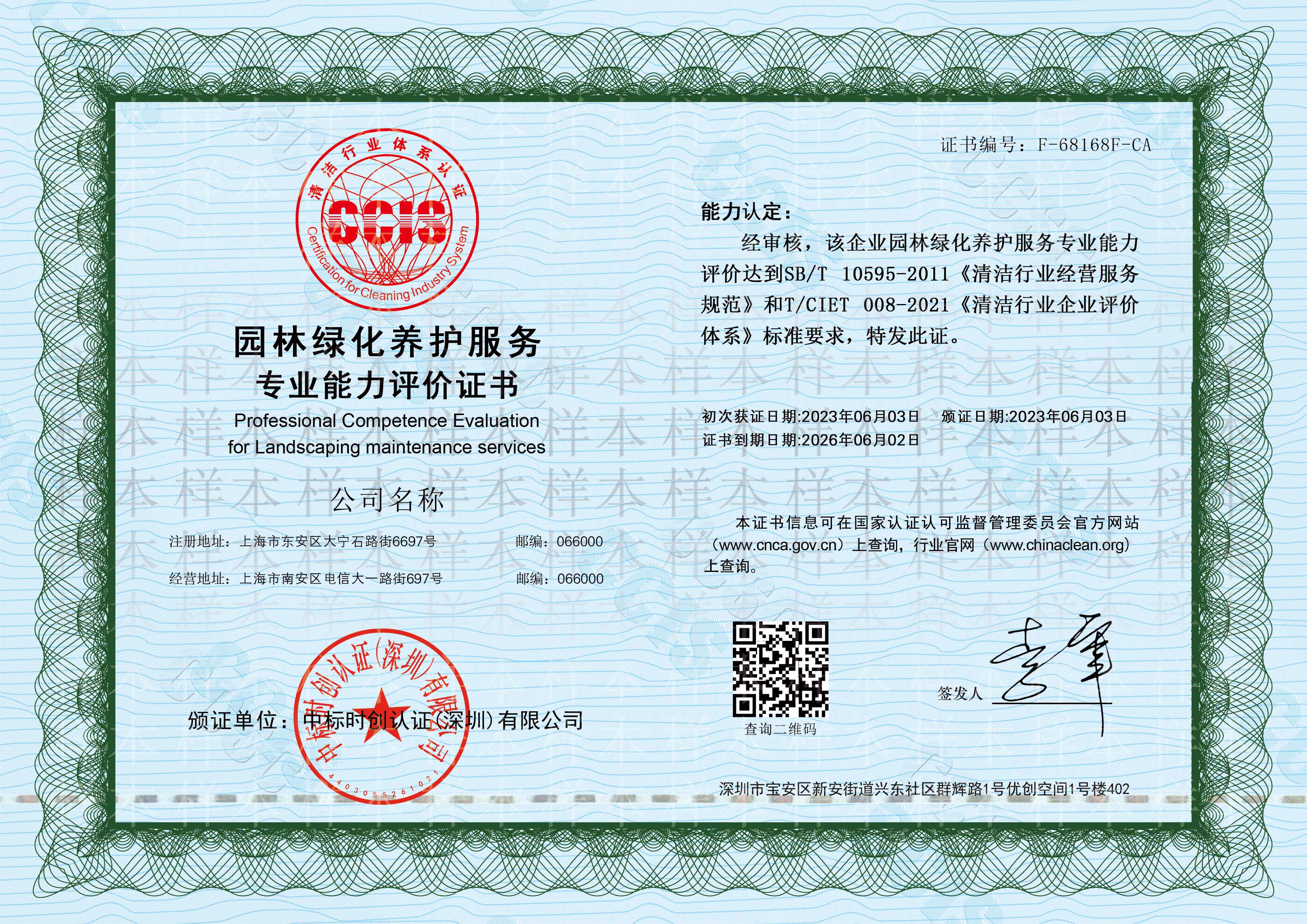“园林绿化养护服务专业能力评价”认证证书是依据商务部行业标准SB/T10595-2011《清洁行业经营服务规范》和团体标准T/CIET 008-2021《清洁行业企业评价体系》,按照国家认证相关规定与要求对企业的认证申请确定审核的可行性、文件评审、编制审核计划、审核组工作的分配和准备审核工作文件,然后进行现场审核,认证复核和认证决定后推荐认证。