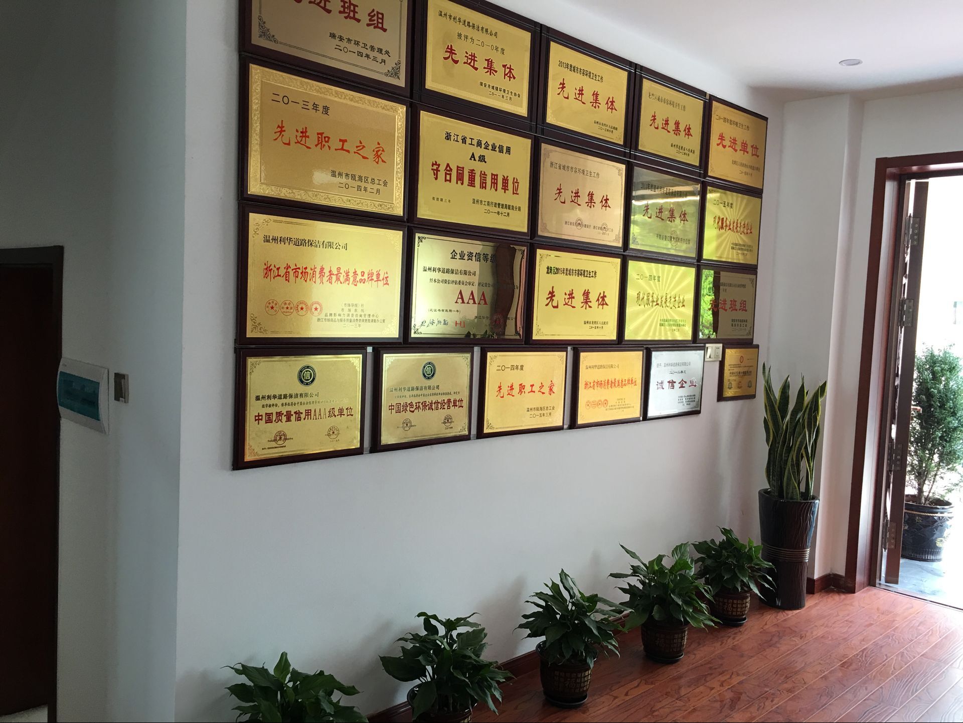 二00八年、二00九年、二0一0年度连续被中共瓯海区委宣传部、瓯海工商行政管理局、瓯海区民营企业评为“诚信企业”;公司一线员工多次评瓯海区、龙湾区、瑞安市、文成县、路桥区评为优秀城市“美容师”;公司董事长李炳华被文成县委、县人民政府评为创建全国级卫生县城和创建省级文明示范县城先进个人;温州利华道路保洁有限公司立足于环卫事业的发展和改革,先后成立了温州利华道路保洁有限公司瑞安市分公司、丽水市分公司、宁波市分公司、南通市分公司、台州市路桥区分公司、文成县分公司、平阳县分公司、嘉兴市分公司、安徽省淮南市分公司、洞头县分公司、永嘉县分公司、乐清市分公司、湖南怀化市分公司,专业于城市(城镇)环卫清扫保洁和垃圾清运工作,全心全意为环卫事业服务,同业主单位共同携手,共同合作为环卫事业添砖加瓦。
