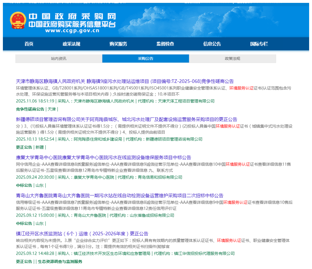 政府采购中,证书是企业合规参与、获得信任的核心依据。它能证明企业服务规范、专业达标,保障采购服务质量,规避返工与处罚风险。同时,无效证书会导致投标无效、项目废标,证书等级还决定企业承接项目的范围,为企业拓展市场提供指引。如天津某项目要求认证范围包含污水处理、环保设施运营托管服务等与本项目相关内容。此外,证书能倒逼企业规范运营,完善环境管理体系,降低环保处罚风险,通过定期复审保障服务持续达标。