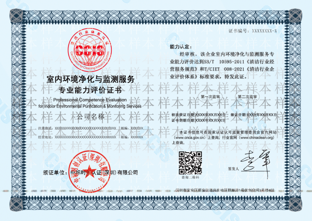 由中标时创认证(深圳)有限公司颁发的CCIS清洁环卫环境行业体系认证“室内环境净化与监测服务专业能力评价证书”是依据商务部行业标准《清洁行业经营服务规范》(SB/T10595-2011)和国促会团体标准《清洁行业企业评价体系》(T/CIET 008-2021),按照国家认证相关规定与要求对企业的认证申请确定审核的可行性、文件评审、编制审核计划、审核组工作的分配和准备审核工作文件,然后进行现场审核,认证复核和认证决定后推荐认证。