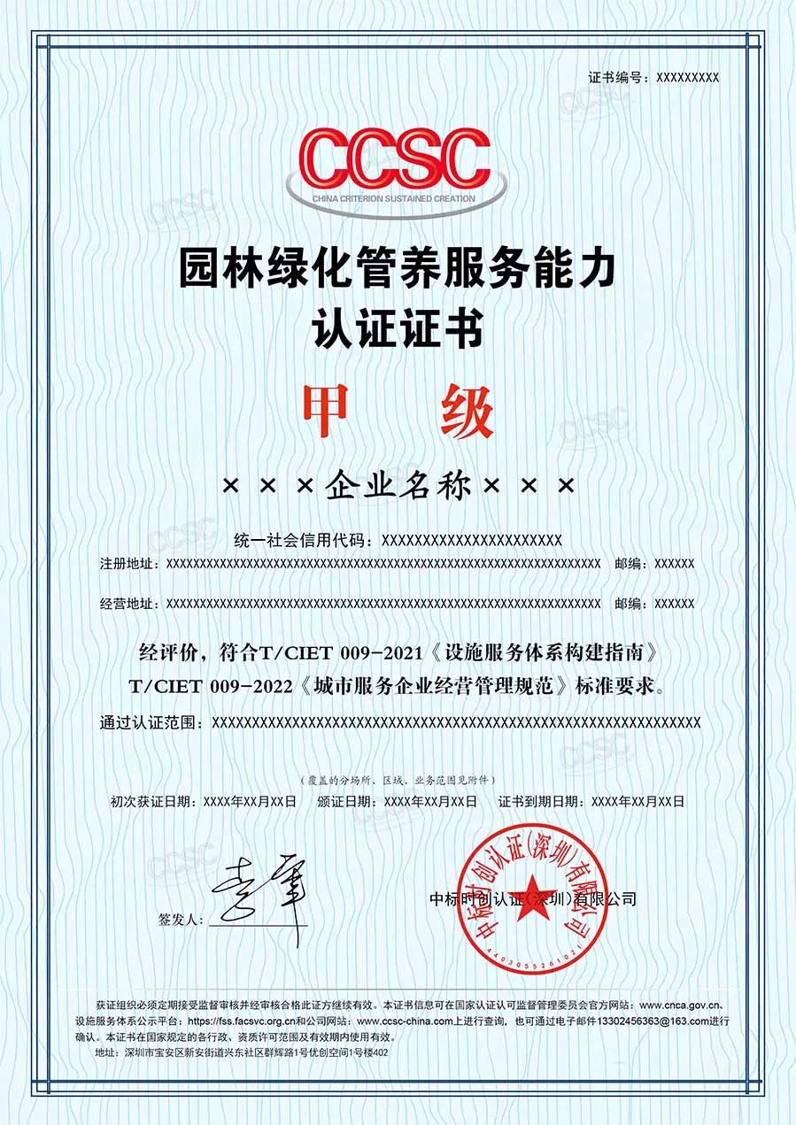由中标时创认证(深圳)有限公司颁发的《园林绿化管养服务能力认证证书》表明企业园林绿化管养服务符合T/CIET 009-2022《城市服务企业经营管理规范》T/CIET/009-2021《设施服务体系构建指南》,严格按照国家认证相关规定与要求,在前期完成认证申请评审和相关文件审核的基础上,派遣审查组进行现场审查,符合认证标准要求,推荐认证。