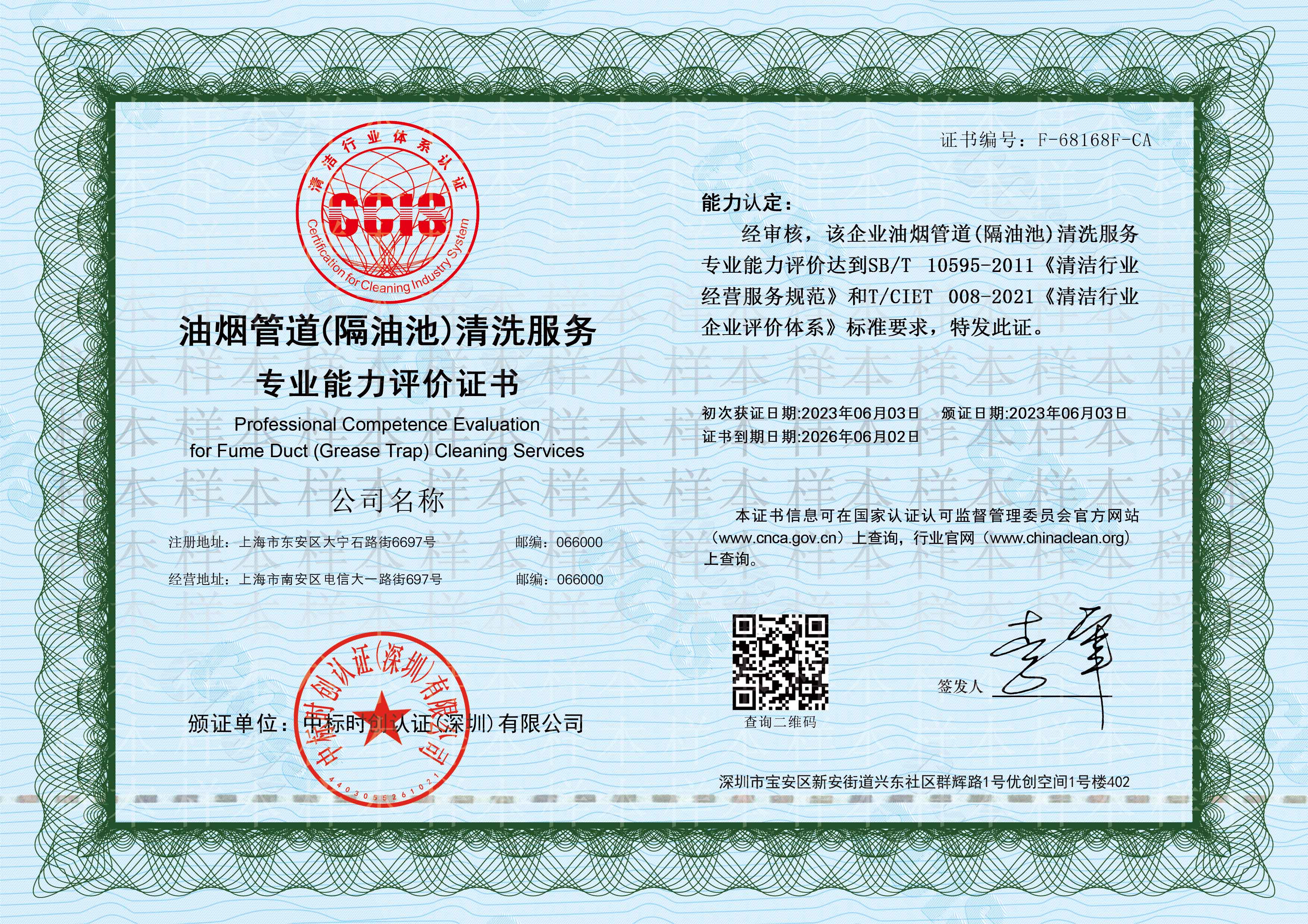 “油烟管道(隔油池)清洗服务专业能力评价”认证证书是依据商务部行业标准SB/T10595-2011《清洁行业经营服务规范》和团体标准T/CIET 008-2021《清洁行业企业评价体系》,按照国家认证相关规定与要求对企业的认证申请确定审核的可行性、文件评审、编制审核计划、审核组工作的分配和准备审核工作文件,然后进行现场审核,认证复核和认证决定后推荐认证。