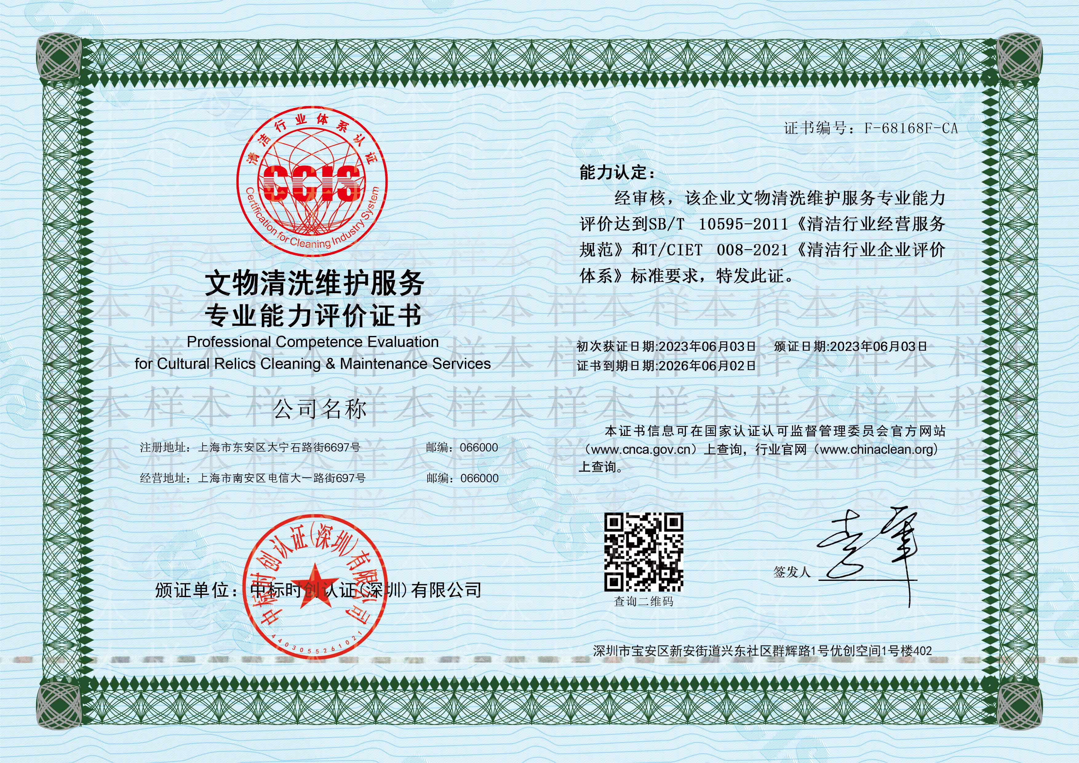 “文物清洗维护服务专业能力评价”认证证书是依据商务部行业标准SB/T10595-2011《清洁行业经营服务规范》和团体标准T/CIET 008-2021《清洁行业企业评价体系》,按照国家认证相关规定与要求对企业的认证申请确定审核的可行性、文件评审、编制审核计划、审核组工作的分配和准备审核工作文件,然后进行现场审核,认证复核和认证决定后推荐认证。