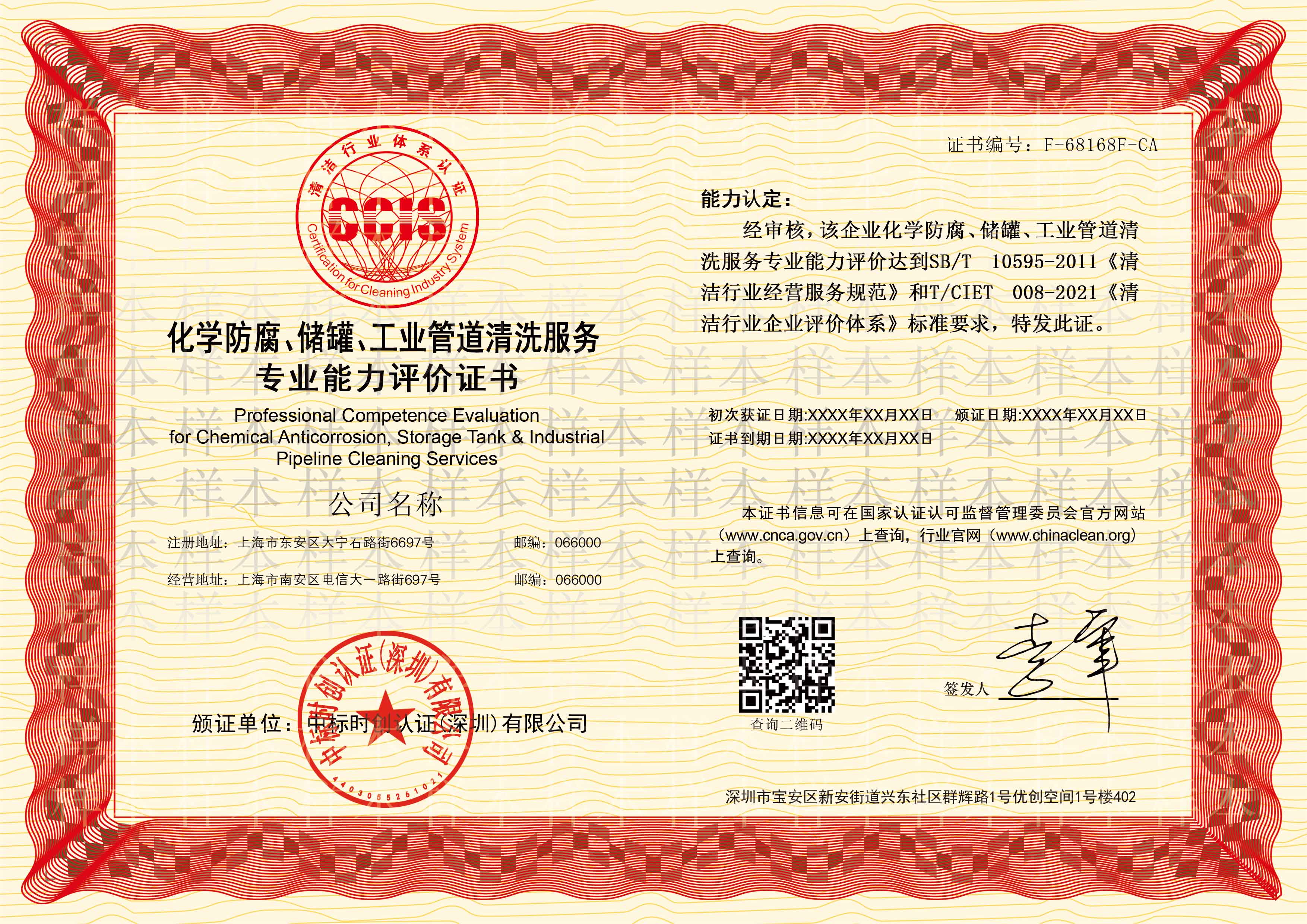 “化学防腐、储罐、工业管道清洗服务专业能力评价”认证证书是依据商务部行业标准SB/T10595-2011《清洁行业经营服务规范》和团体标准T/CIET 008-2021《清洁行业企业评价体系》,按照国家认证相关规定与要求对企业的认证申请确定审核的可行性、文件评审、编制审核计划、审核组工作的分配和准备审核工作文件,然后进行现场审核,认证复核和认证决定后推荐认证。