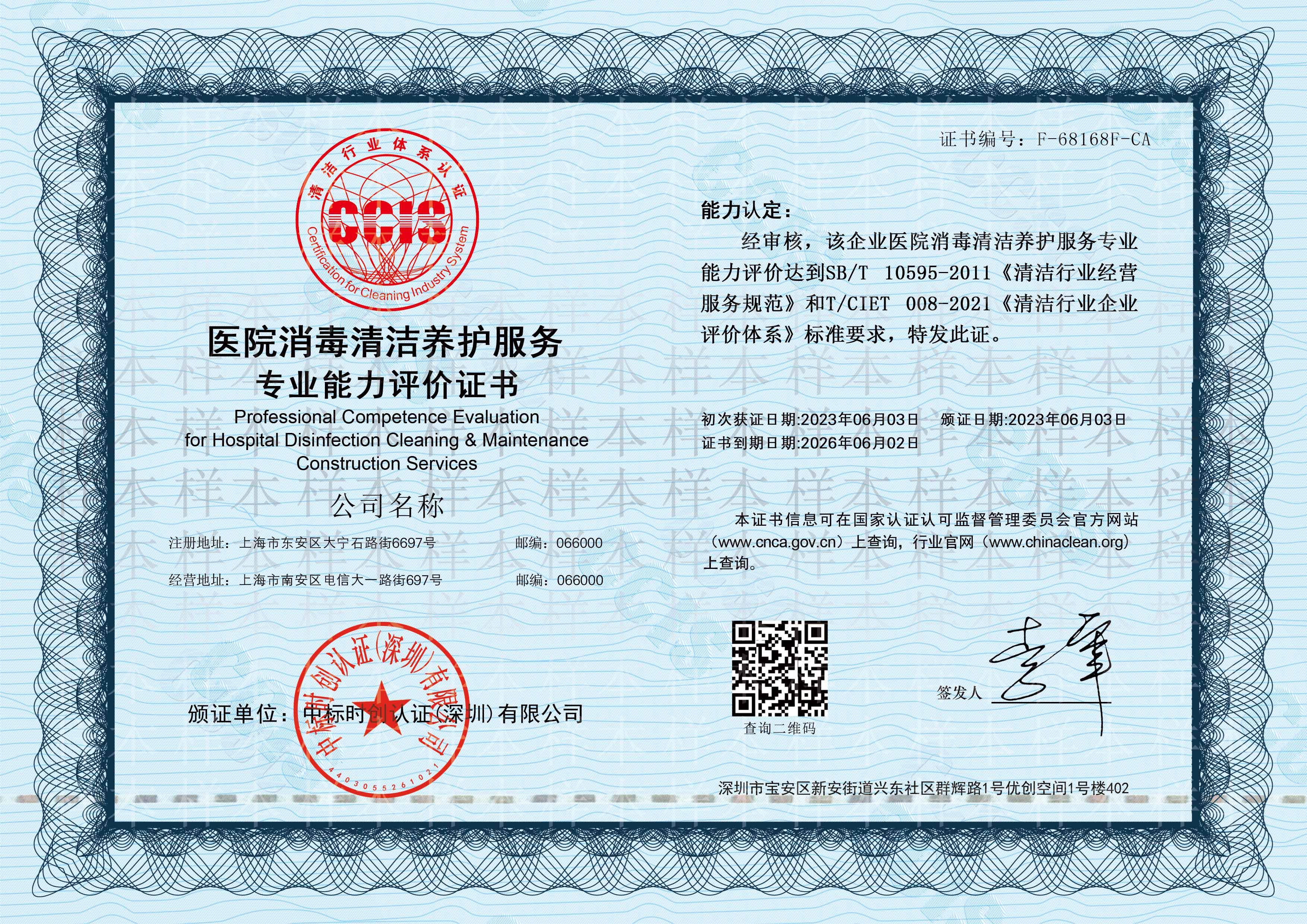“医院消毒清洁养护服务专业能力评价”认证证书是依据商务部行业标准SB/T10595-2011《清洁行业经营服务规范》和团体标准T/CIET 008-2021《清洁行业企业评价体系》,按照国家认证相关规定与要求对企业的认证申请确定审核的可行性、文件评审、编制审核计划、审核组工作的分配和准备审核工作文件,然后进行现场审核,认证复核和认证决定后推荐认证。
