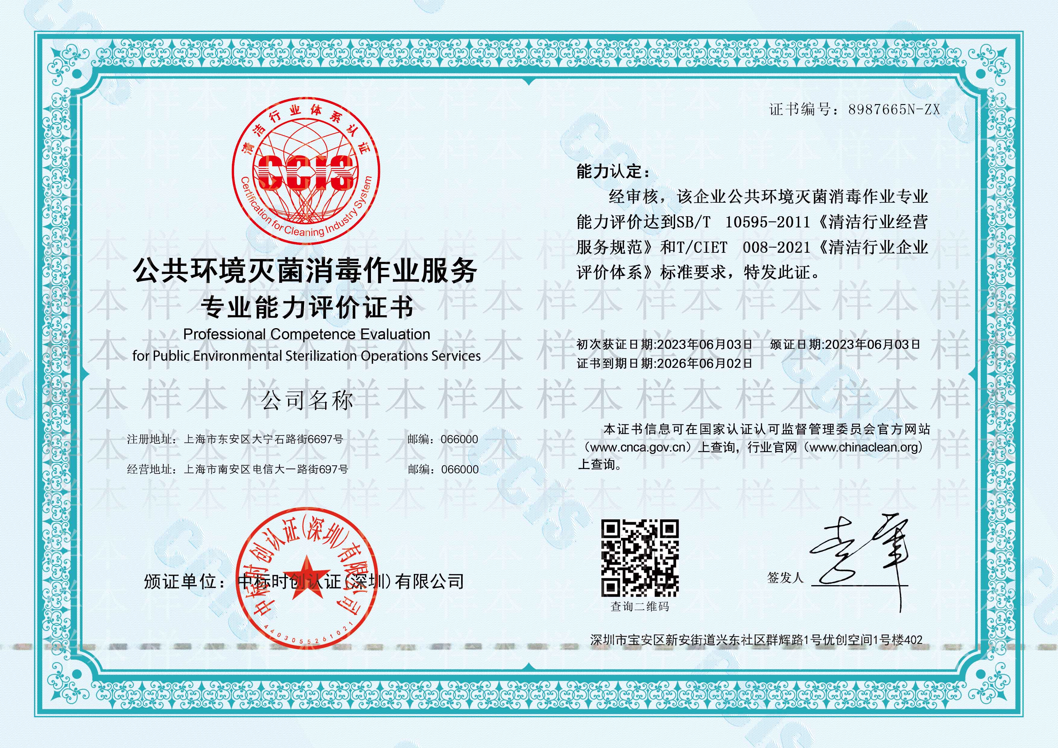“公共环境灭菌消毒作业服务专业能力评价”认证证书是依据商务部行业标准SB/T10595-2011《清洁行业经营服务规范》和团体标准T/CIET 008-2021《清洁行业企业评价体系》,按照国家认证相关规定与要求对企业的认证申请确定审核的可行性、文件评审、编制审核计划、审核组工作的分配和准备审核工作文件,然后进行现场审核,认证复核和认证决定后推荐认证。