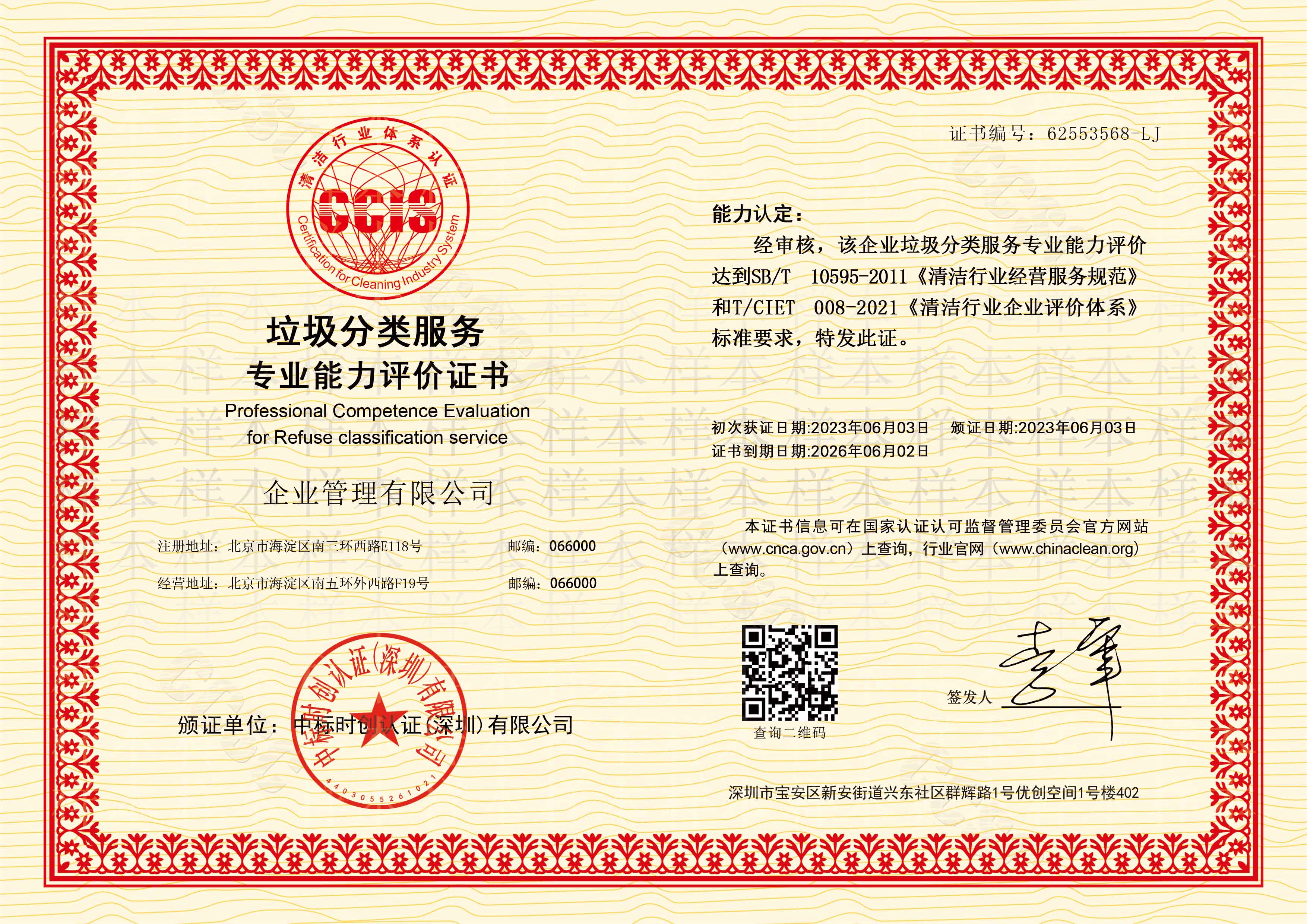 “垃圾分类服务专业能力评价”认证证书是依据商务部行业标准SB/T10595-2011《清洁行业经营服务规范》和团体标准T/CIET 008-2021《清洁行业企业评价体系》,按照国家认证相关规定与要求对企业的认证申请确定审核的可行性、文件评审、编制审核计划、审核组工作的分配和准备审核工作文件,然后进行现场审核,认证复核和认证决定后推荐认证。