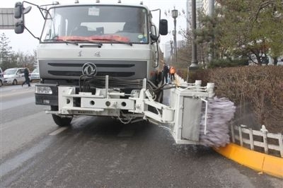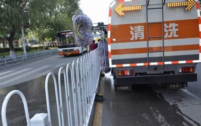 5月13日,记者在五四大街上看到,侧面带着大型毛刷的清洁车辆沿路中间缓缓行进,随着大毛刷不停地旋转和喷水,车辆所过之处的街路中间的白色防护栏就被清洗得干干净净,路边行人纷纷侧目观看。附近的环卫工人讲,原来街道中间的防护栏都靠人工清洁,要拿着抹布、刷子,提着水桶,成群结队地蹲在道路中间刷洗防护栏,既不安全,干得又慢,现在这种机械上路后问题就解决了。