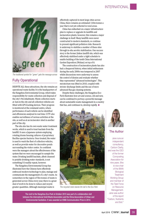 编者按:时值第十一届G20峰会在杭州召开,杭州市环境集团收到一份“国际评价”:国际固废行业知名学术期刊《英国废弃物管理协会会刊》刊登了JANE GILBERT博士讲述的杭州垃圾治理故事,中国走向生态文明新时代,这篇文章成为向世界展示美丽中国杭州样本独特韵味和别样精彩的一个花絮。
