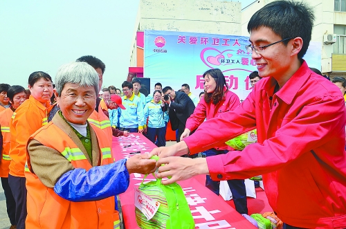 | 收到“爱心驿站”赠送的大礼包,环卫工人代表满面笑容。 |