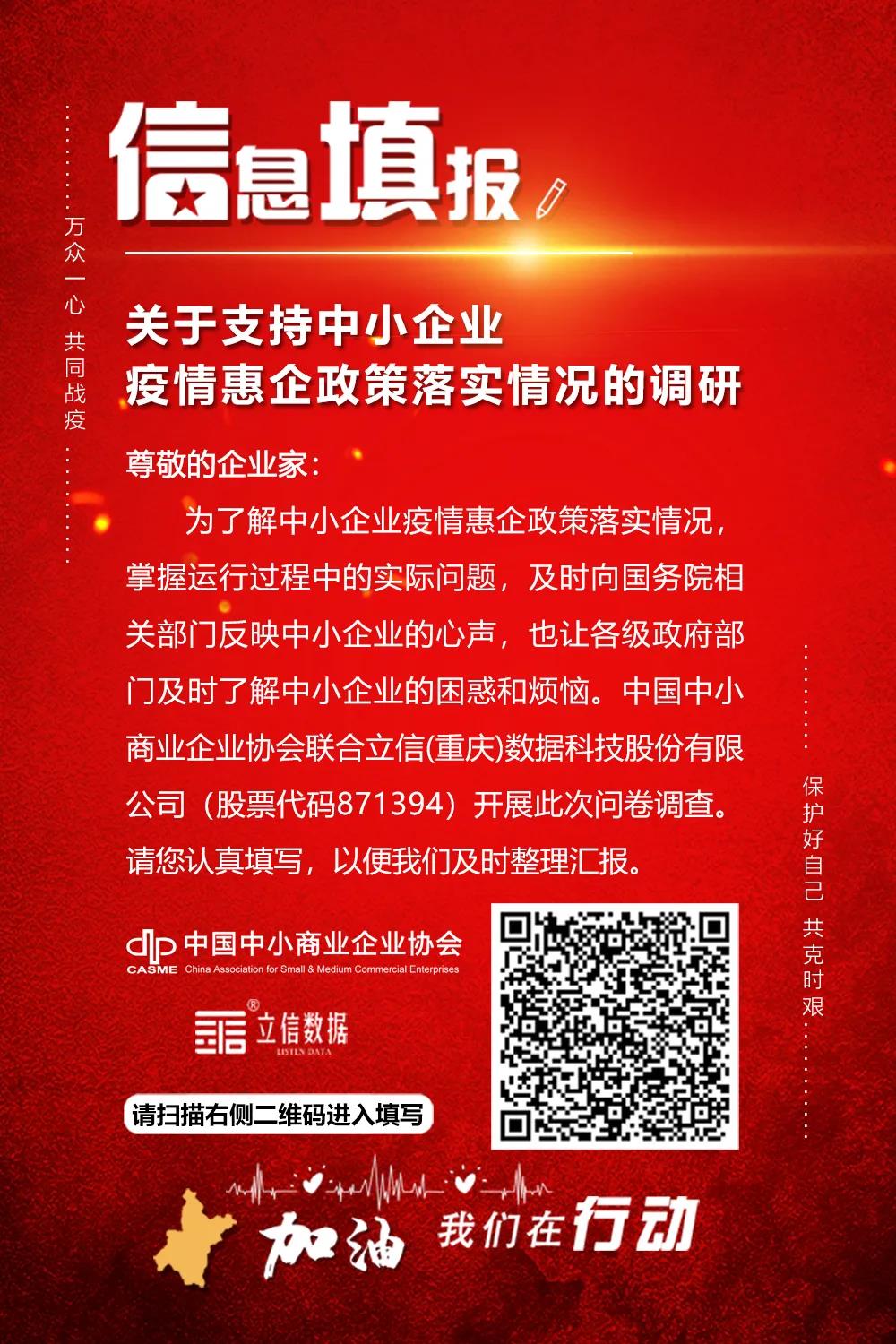 为了解中小企业疫情惠企政策落实情况,掌握运行过程中的实际问题,及时向国务院相关部门反映中小企业的心声,也让各级政府部门及时了解中小企业的困惑和烦恼。中国中小商业企业协会联合立信(重庆)数据科技股份有限公司(股票代码871394)开展此次问卷调查。请您认真填写,以便我们及时整理汇报。