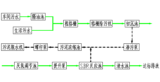由于受场地限制,工艺流程不宜太长,因而选用SBR反应池作为核心构筑物,车间污水中矿物油由隔油池去除;粗格栅、格栅除污机、初沉池能够去除大部分的悬浮物,厌氧调节池兼有调节水质水量和水解酸化的作用,能降解部分有机物。