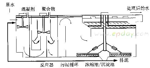 混合区配置Ф500混合搅拌机18套,絮凝区配置Ф3600絮凝搅拌机18 套,浓缩区配置Ф17 m浓缩刮泥机18套,剩余污泥泵18用6备,回流污泥泵18用6备。另外,设投药系统,包括混凝剂化解、稀释、配比及投加,用PLC控制。