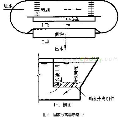 众所周知一体化氧化沟是集生物处理与固液分离于一体。在本工艺中,固液分离是在氧化沟的侧沟与中心岛的固液分离器中进行的(见图2),它们是一体化氧化沟技术的关键,同时具有固液分离和污泥回流两大功能,直接决定着出水水质的好坏。