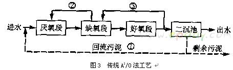 (2)缺氧段和好氧段之间实现了混合液的水力内回流,省掉了一套机械回流装置,如标号③。