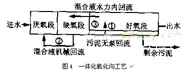 在A2/O除磷脱氮工艺中,为了保证各阶段的生物量,一般来说需要三种不同的回流(见图3),而一体化氧化沟的回流却有着明显的不同(见图4)。由图4可以看出,一体化氧化沟的回流具有如下特点: