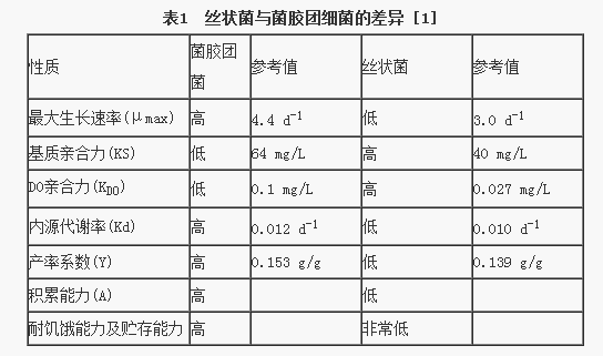 活性污泥是一混合培养系统,其中至少存在着30种可能引起污泥膨胀的丝状菌。在丝状菌与菌胶团细菌平衡生长时不会产生污泥膨胀问题,只有当丝状菌生长超过菌胶团细菌时,才会出现污泥膨胀。丝状菌和菌胶团细菌的生理和生化性质差异见表1。