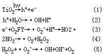 当以光子能量≥TiO2带隙能(3.2 eV)的光波辐照TiO2时(λ≤387.5 nm),处于价带的电子被激发到导带上生成高活性电子(e-),在价带上产生带正电荷的空穴(h+)。TiO2与水接触后,水分子及溶解氧与被光激发产生的h+、e-作用,生成强氧化性的OH、O2-,并通过OH、h+和O2-等逐步将有机物降解为CO2和H2O等无机物,上述反应可描述如下: