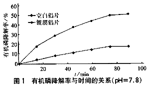 由图1可知,甲胺磷农药废水在不同体系中的降解率有较大区别。在放有空白铝片的池中,紫外线对有机磷具有一定的光解作用,在90 min时降解率为16.21%;在有镀膜铝片的池中,有机磷的降解率明显提高到50.28%,说明TiO2对废水具有明显的催化作用。