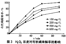 由图3可知,H2O2对废水中有机磷的降解有显著的影响,投加H2O2浓度在500 mg/L 以下对体系均有促进;超过此浓度投加,催化效率反而呈下降趋势。其原因是H2O2 是光生电子e-的有效俘获剂,可以阻止h+和e-的重新复合并增加了OH在TiO2表面 的形成机会;同时,H2O2又是OH的清除剂,当H2O2浓度过高、产生的OH急剧增加时,OH在未与有机物反应之前就相互碰撞致使有机磷的降解率下降。