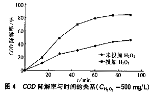 在投加H2O2和未加H2O2的条件下对废水进行光催化降解的试验结果见图4。
