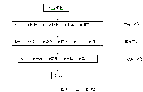 该厂制革生产工艺流程如图1所示。制革废水主要来自准备工段和鞣制工段,有含高浓度氯化物的原皮洗涤水和浸酸水,含石灰和硫化钠的强碱性脱毛浸灰废水,含三价铬的蓝色铬鞣废水,含丹宁和没食子酸的茶褐色植鞣废水,含油脂及其皂化物的脱酯废水,加脂染色废水和各工段冲洗废水等,其中以脱脂废水、脱毛浸灰废水、铬鞣废水污染最为严重。