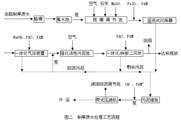 厂区内各路制革污水经格栅后进入集水池;再由泵提升至预曝气调节池,此池中视水质情况投加Ca(OH)2(调节pH在8~9之间,一般勿需调)、MnSo4进行催化氧化脱硫;再泵至竖流式沉降器,管道混合投加FeSO4和PAM-,使S2-形成FeS↓沉淀,Cr3+形成Cr(OH)3↓,去除绝大部分SS、S2-和Cr3+;上清液自流入一体化气浮装置,在搅拌作用下依次投加适量液碱、PAC、PAM-,彻底去除细小SS和Cr(OH)3微絮体,确保生化进水水质;出水用管道泵提升至强化活性污泥池,大幅度去除溶解性的有机物;然后再自流入斜板二沉池,视水质情况投微量PAC和PAM-,确保出水达标排放。二沉污泥大部分回流至生化池补充菌种,剩余污泥同初沉、气浮污泥一并进入污泥储池,再由带式压滤机脱水后外运妥善处置。