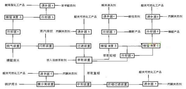 7、由中和装置处理后的水质直接进入自行设计自制的膜分离装置,对处理后的水质可直接进入生产锅炉循环使用,因膜分离浓缩后的物质可通过投入0.1%的丙酮药剂类条件下进入调合器,接受醛类化工产品。