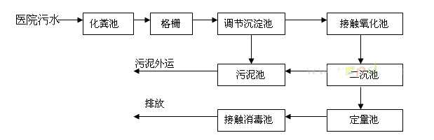 化粪池:化粪池设在各主要建筑物排出污水干管上,按国家医院污水处理设计规范,污水在化粪池中的停留时间不小于36小时,污水中的粪便、虫卵等悬浮杂质、以及污泥池回流的浓缩污泥被化粪池截流下来并进行厌氧分解,污水达到初步处理[2]。