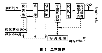 本工程污水量比较大,同时考虑卫生部关于2000年以后大中型医院污水量为1000L/(床d)的要求,采用了平流沉淀池再次处理,达到比一级处理更好的综合处理效果。