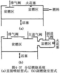 分层燃烧的实质是采用上述的浓淡燃烧原理,其基本结构如右图所示的直接喷射(如德士古公司TCP系统,福特公司PROCO系统)和副燃烧室(如本田公司CVCC系统,大众公司PCI系统)两种型式。图中(a)是依靠进气涡流或采用机械方式,使进入气缸内的混合气实现浓度的依次分层;图中(b)则是设置预燃室达到分层进气目的。在燃烧室内,空燃比为12~13.5易于点燃的浓混合气聚积在火花塞周围,以确保可靠的着火条件,而其余大部分区域充满稀混合气,使总的平均空燃比保持在18以上。汽油机工作时,火花塞首先点燃浓混合气,然后利用燃烧后产生的高温、高压和气流运动,使火焰迅即向稀混合气区域传播和扩散,从而保证稳定的燃烧。