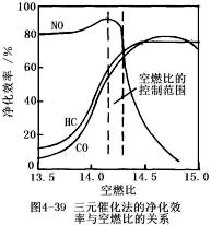 三元催化反应器的净化效率与空燃比密切相关,右图所示。由图可见,当空燃比处于富燃料时,HC和CO净化效率变差,而当空燃比处于贫燃料时,则NO净化效率下降。因此,为了能同时高效净化三个成分,空燃比的允许范围较窄,要求精确控制在±0.25左右,如果配备电控燃料喷射可获得最佳的净化效果。该装置净化效果及经济性较好,但成本较高,精密控制空燃比的方法还需深入研究。