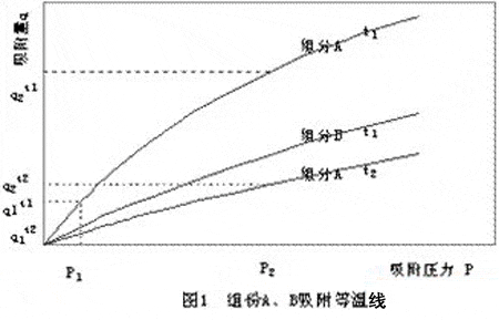 气体吸附分离技术是近年发展较快的一项新技术, 按照再生方式的差异常分为变压吸附法和变温吸附法两类:(1)变压吸附(英文名称Pressure Swing Adsorption,简称为PSA)法提纯或分离单元是根据恒定温度下混合气体中不同组份在吸附剂上吸附容量或吸附速率的差异以及不同压力下组分在吸附剂上的吸附容量的差异而实现的,由于采用了压力涨落的循环操作,强吸附组份在低分压下脱附,吸附剂得以再生;吸附剂的使用寿命一般为十年以上,所以PSA过程基本是无原料消耗过程;(2)变温吸附法(英文名称 Temperature Swing Adsorption,简称为TSA)或变温变压吸附法(简称为PTSA)是根据待分离组份在不同温度下的吸附容量差异实现分离,由于采用温度涨落的循环操作,低温下的被吸附的强吸附组份在高温下得以脱附,吸附剂得以再生,冷却后可再次于低温下吸附强吸附组份。确定是否采用吸附法分离的主要依据为待分离组分之间的吸附等温线,图1为待分离组分A(污染物)、B(非污染物)的在温度为t1或t2的吸附等温线所示: