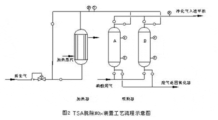 PSA、TSA或PTSA 过程的连续运行通常是通过多个吸附器依靠阀门切换实现的,当某些塔在吸附时,其它的吸附器则处于再生等步骤;吸附饱和后的吸附剂需要再生时,其它已再生好的吸附器开始进入吸附步骤,如此实现循环操作。下图为西南化工研究院实验开发成功的TSA净化并回收硝酸尾气中NOx的流程示意图。