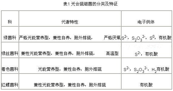 光合硫细菌主要分为两大类:(1)严格光能自养型,主要包括着色菌科(chromatiaceae)的着色菌属和绿菌科(chlorobiaceae)的绿菌属;(2)兼性光能自养型,它们能以有机物(简单的有机酸类或醇类)作为电子供体和碳源,主要包括红螺菌科(rhodopirillaceae)的红螺菌属、红假单胞菌属、红微菌属以及绿菌科(chloroflexacae)。表1列出了几种典型光合硫细菌的生理特性,可以看出大多数光合硫细菌是体外排硫的。