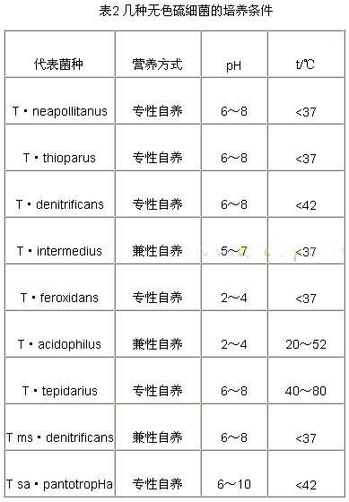“无色硫细菌”(Colourless sulfur bacteria)只是一个生理学惯用词,而不是分类学名词。实际上,有些无色硫细菌的纯培养菌苔呈粉红或棕色,说明其体内含有细胞色素。无色硫细菌种类繁多,且各自具有不同的生理学、形态学和生态学特征,对环境条件的要求也有差异,如表2所示。其中硫杆菌属(thiobacillus)是土壤和自然水体中最常见的一种无色硫细菌,一般是无芽孢的短杆菌,革兰氏阴性,端生鞭毛,能将硫化物氧化成单质硫或硫酸盐,或将硫代硫酸盐氧化为硫酸盐。大多数无色硫细菌都在pH中性、中温条件下生活。但也有研究表明,无色硫细菌可生活的环境范围很广,在pH1.0~9.0、温度4~95℃的条件下都有无色硫细菌生长和活动;对DO的要求很宽松,在高至饱和浓度低至完全无氧状态下,都有无色硫细菌生存。研究还发现,环境条件的改变会引起某些无色硫细菌营养方式的改变,如:acidianus在好氧条件下,氧化硫化物生成单质硫;而在厌氧条件下,则以H2作为电子供体,将单质硫还原为硫化物,即这种细菌随着环境条件的改变,会由硫氧化菌转变为硫还原菌。