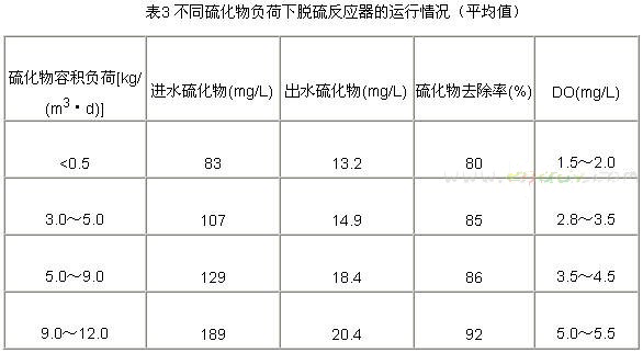 能否在高硫化物负荷下保持较好的脱硫效果,是衡量脱硫反应器的一个重要指标。左剑恶通过试验得出以下数据,表3列出了不同硫化物负荷下脱硫反应器的运行情况: