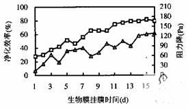 图2 挂膜期间的净化效率与阻力降曲线