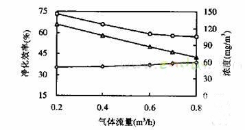 图3 气体流量对净化效率及进出口甲苯浓度的影响