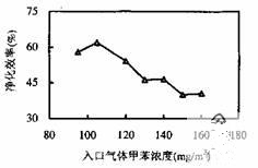 气体流量0.8m3/h,入口气体甲苯浓度95-160mg/m3