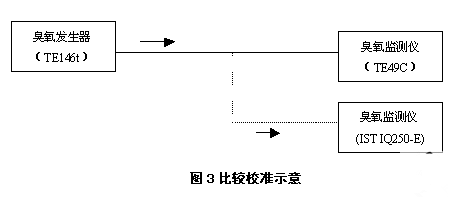 用于环境空气监测的臭氧监测仪采用紫外光度法原理,便携式臭氧监测仪器采用电化学法原理。前者的测量量程比后者要宽,分辨率比后者高10倍,无论是测量准确度还是精密度都是前者比后者优越。因此,在计量部门暂时还不受理该种仪器计量检定的情况下,我们考虑采取仪器比对的方法将测量环境空气的紫外光度法臭氧监测仪与电化学法现场式臭氧监测仪进行比对校准。