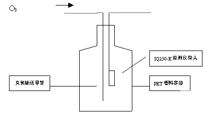 由于IQ250-E臭氧监测仪为一款扩散式臭氧监测仪器,为使监测仪的探头处于稳定的臭氧浓度环境中,我们设计了一个装置。将IQ250-E仪器的测量探头放置于一个PET塑料容器中,将臭氧输送导管置于容器的底部,瓶口用密封膜封口,只留一小孔(用于平衡瓶内外压力)。将臭氧发生器的流量控制在4 L/min,使整个容器内部略呈正压,保证整个容器内部的臭氧浓度均匀。由于臭氧发生器源源不断发出臭氧,因此容器壁对臭氧的吸附在此可以忽略不计。每次改变臭氧浓度需等数分钟,待仪器响应稳定后记录读数。连接装置见图1。